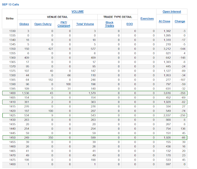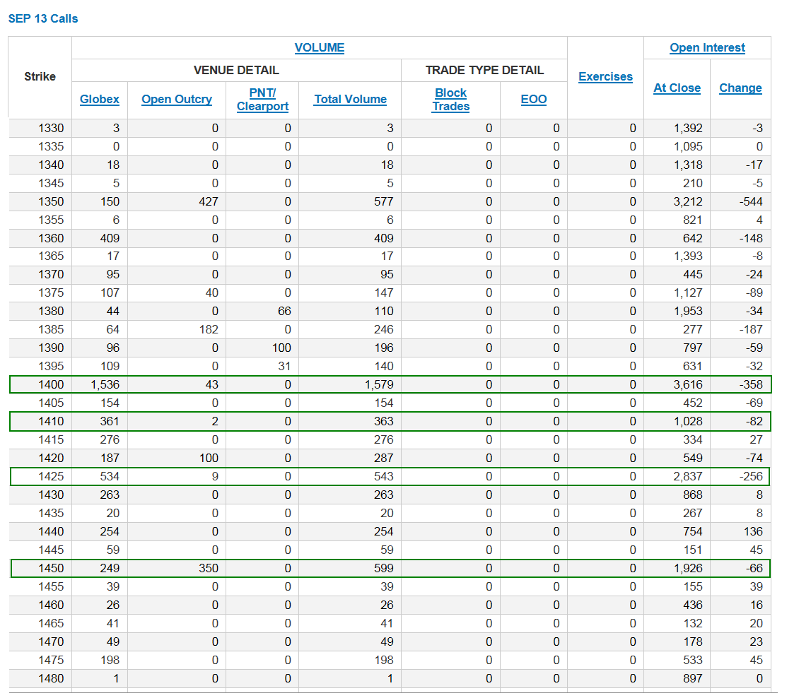 I have included a snapshot of the calls that are subject to expiration this week in gold, and their distribution by strike price. There are about 8,800 calls between 1400 to 1425 that will be expiring this week.