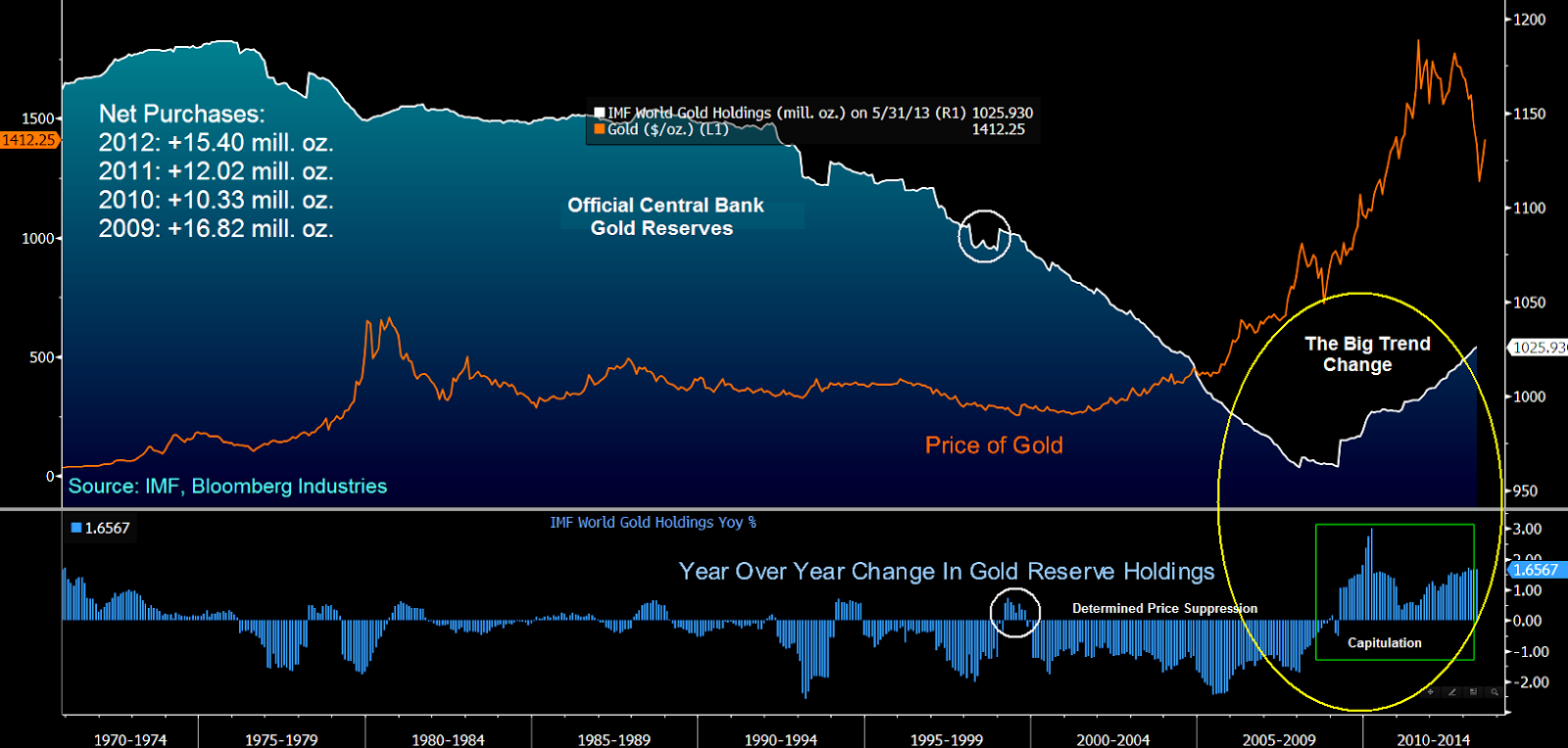 Few people realize that around 2008 central banks turned from being net sellers of gold to net buyers, and began to accumulate gold reserves in a big way for the first time since the 1970's, when Nixon slammed shut the gold window.