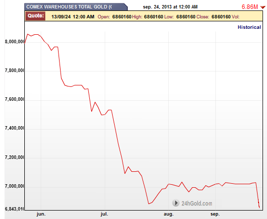 This takes the total gold in all of the COMEX warehouses to a new low of 6,860,160 ounces in 100 oz. bars.