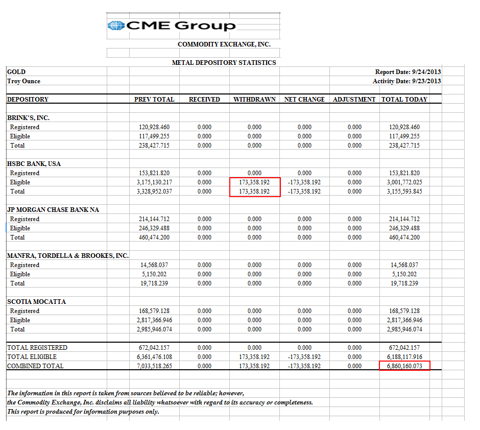 On Monday 173,582 ounces, or roughly five tonnes, of customer gold was withdrawn the HSBC warehouse.