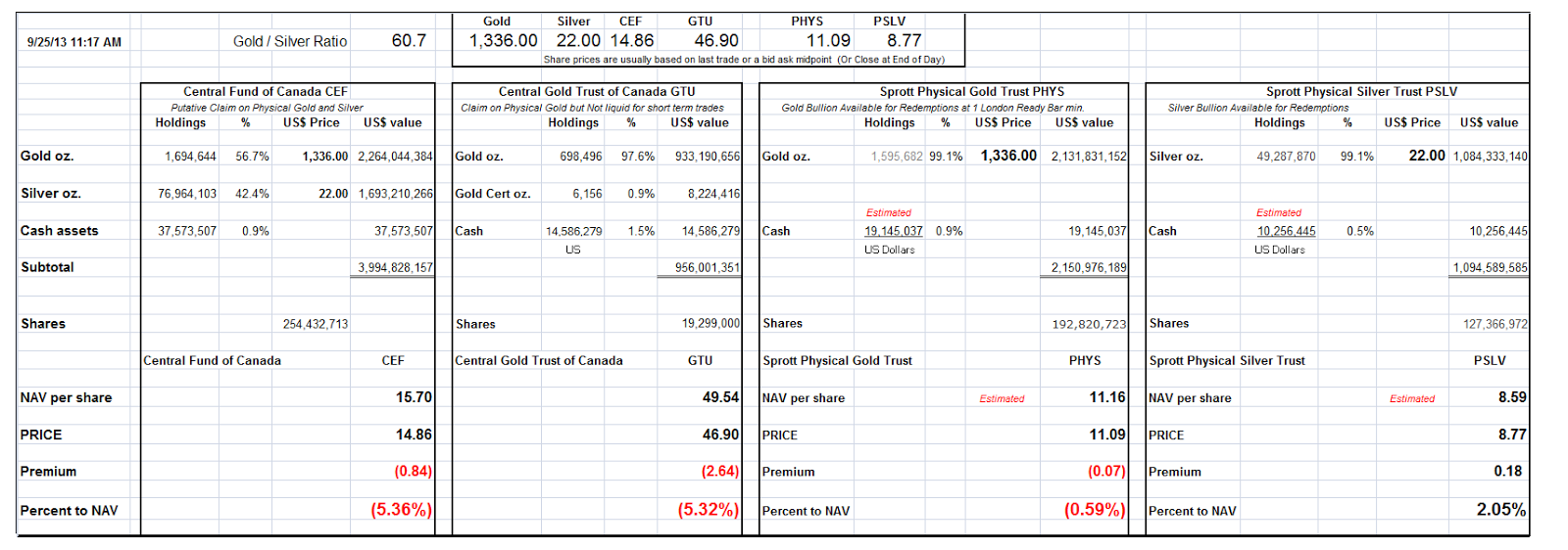 NAV Premiums of Certain Precious Metal Trusts and Funds