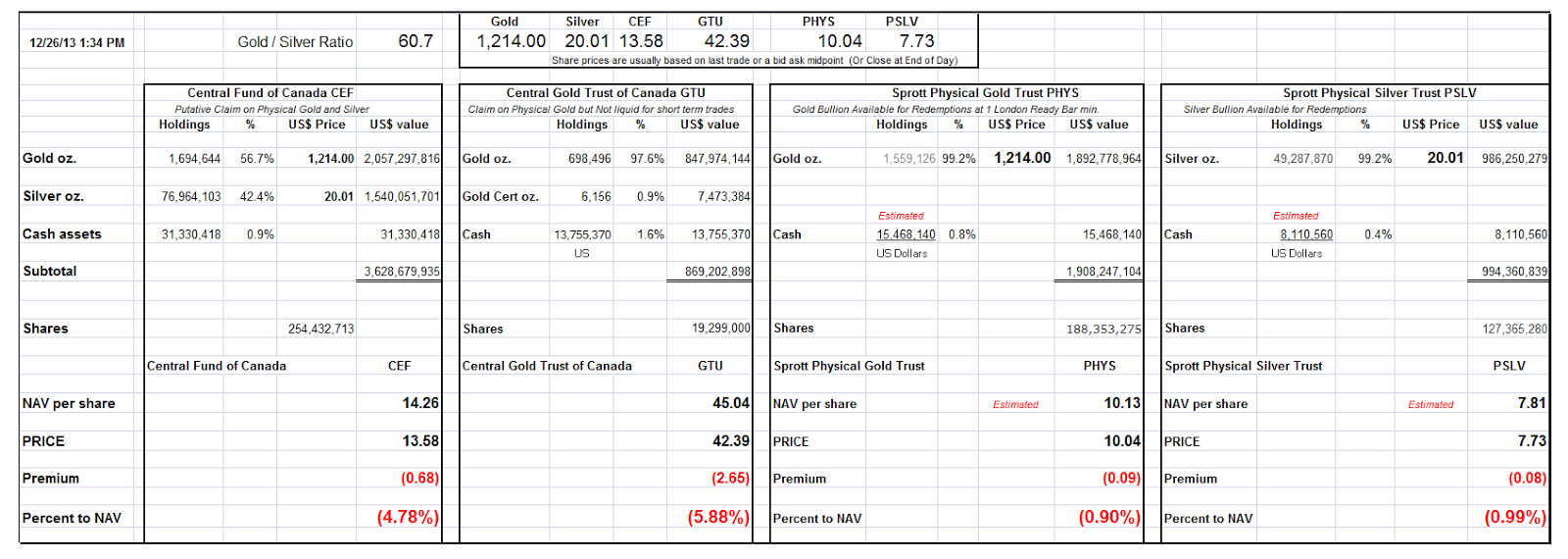 A bit of a surprise in the premium on Sprott Silver which is carrying a slightly negative premium and on a par or a bit lower than gold. That is unusual historically except when they are engaging in a secondary offering.