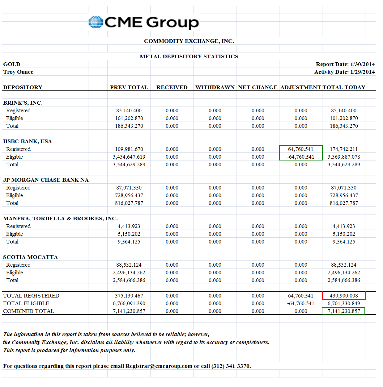HSBC had 65,760 ounces of gold adjusted from storage to deliverable, so that brings the overall registered ounces of gold in the Comex warehouses to a still thin 439,000 ounces.