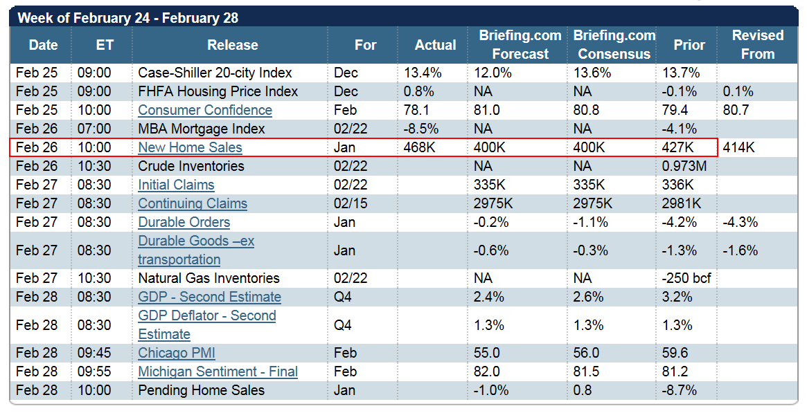 The New Homes Sales number came in much higher than expected this morning, and so stocks reversed from their initial slump. They rose to challenge the overhead resistance once again, only to fall back down in the afternoon.