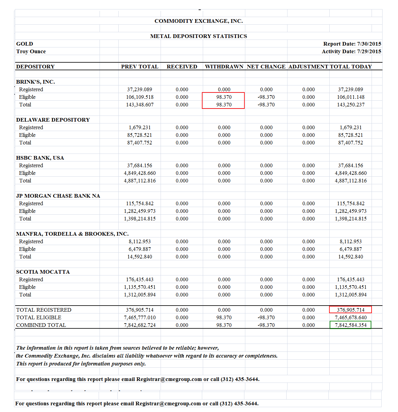 The next shows the results of the attempts to knock down the open interest at Comex. It has succeeded a bit, but these lower prices taken to shake out the bulls are not enticing many to put their actual bullion up for delivery.
