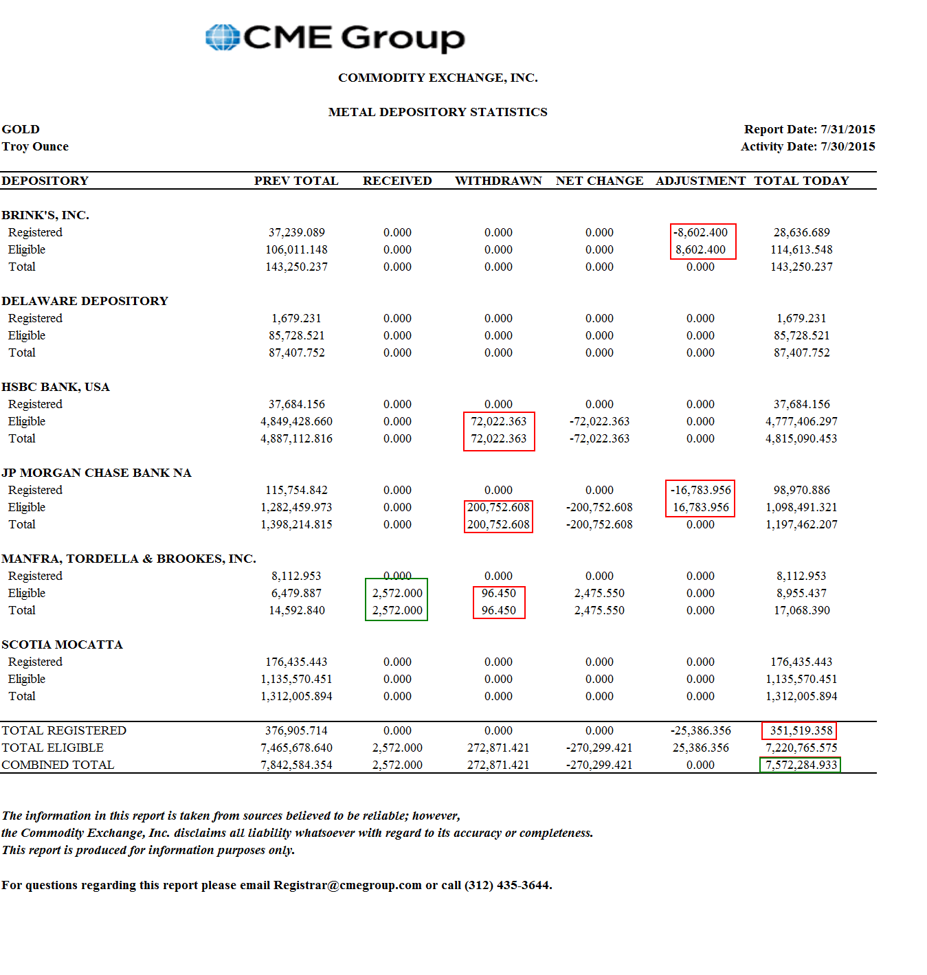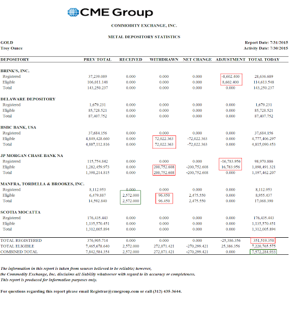 I have included the most recent statistics from the Comex Gold Warehouses below. There are currently 351,519 ounces of gold available for delivery at these prices there for the month of August.