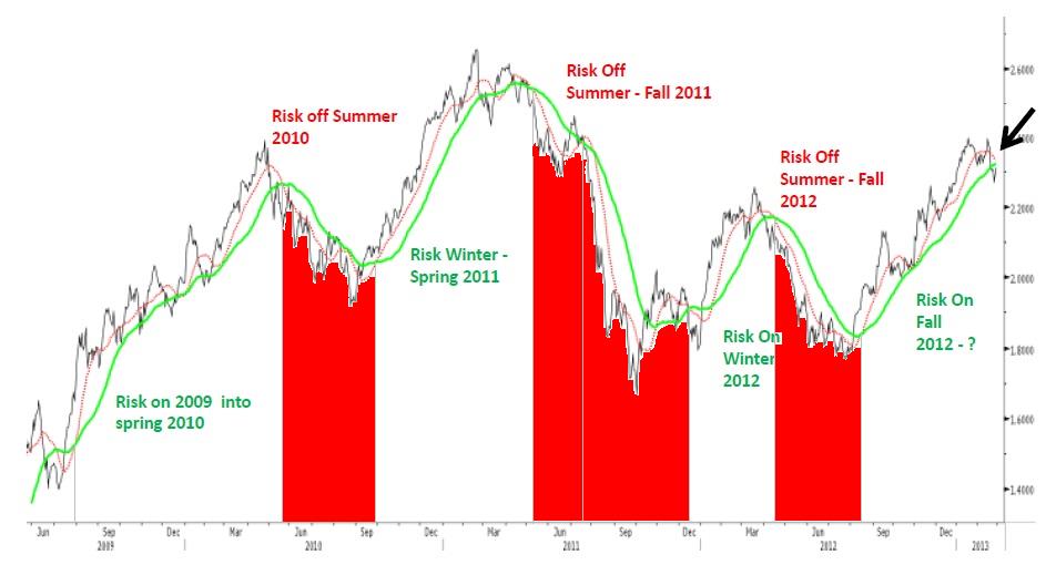 I would like to add the obvious that gold tends to move inverse to this, except when 'risk on' is being fomented by a general increase in liquidity that is causing most asset prices to rise. Then we have that odd phenomenon when gold and stocks move in a correlated manner. And similarly, when there is a general liquidation gold falls with stocks.