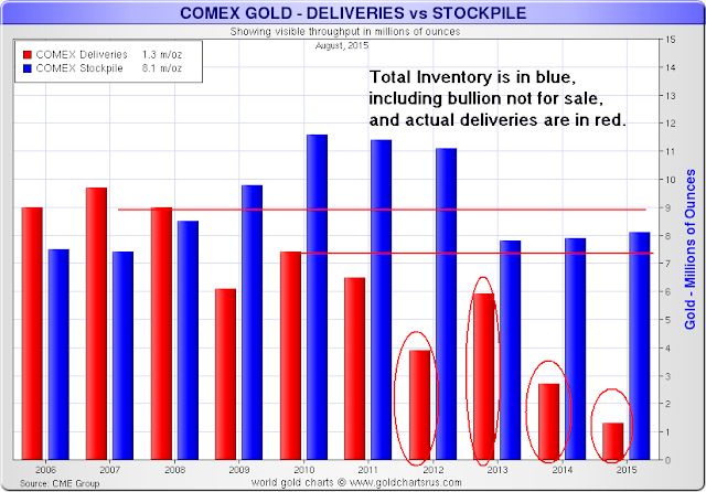As should be easy to see, the amount of gold bullion deliveries is declining quite a bit.