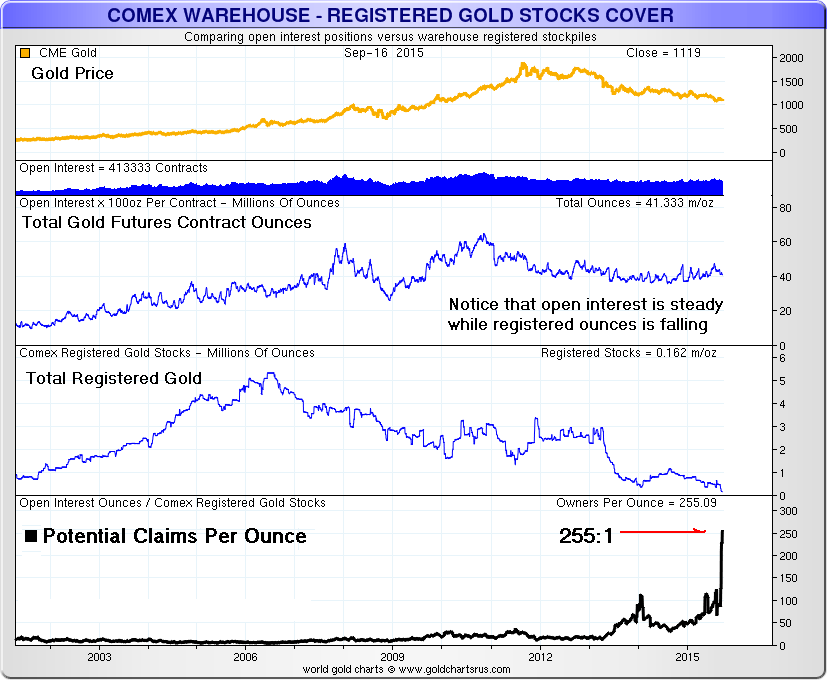 Let's take a quick look at the ratio of total contracts to registered gold, that is gold up for sale.