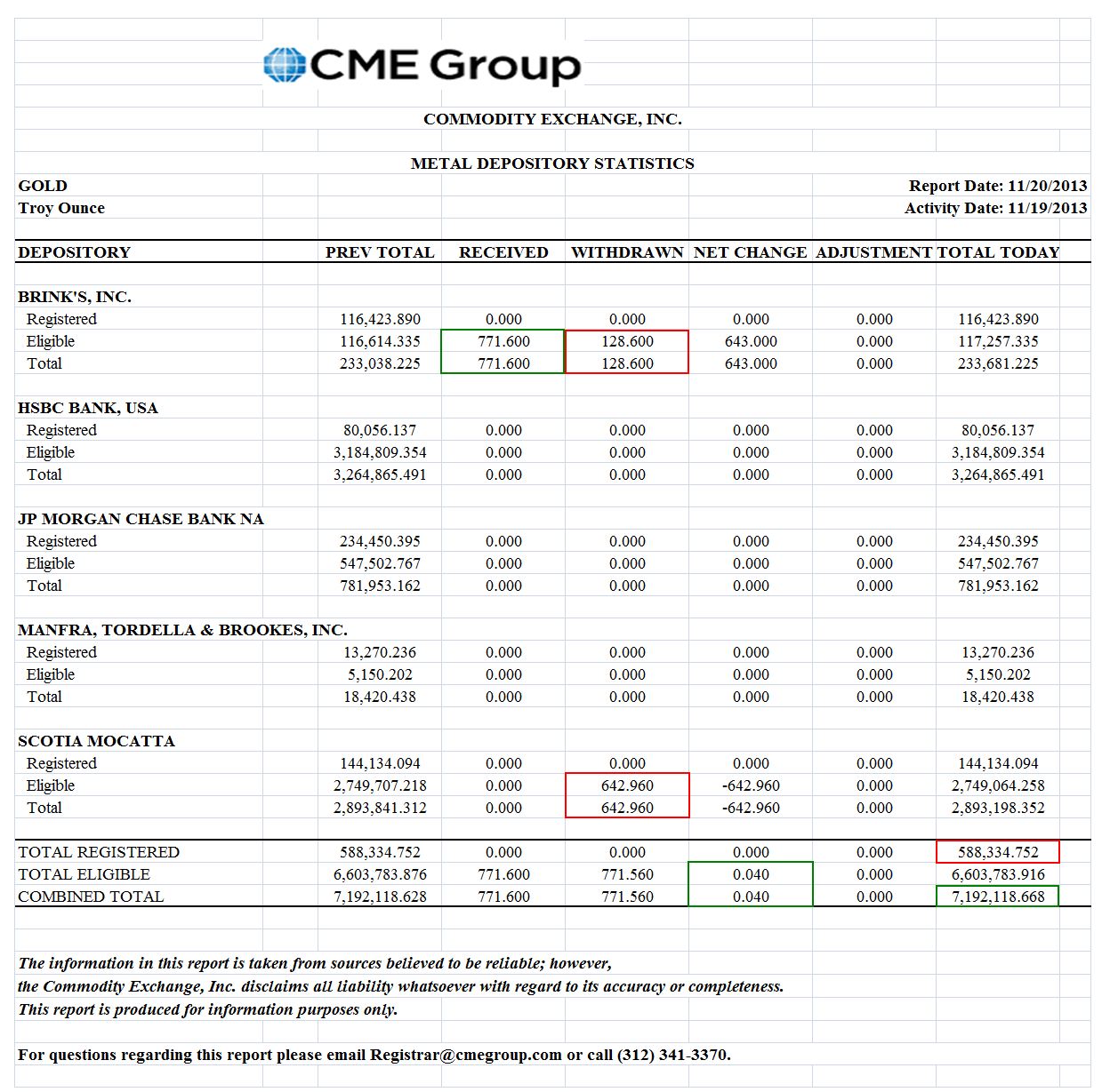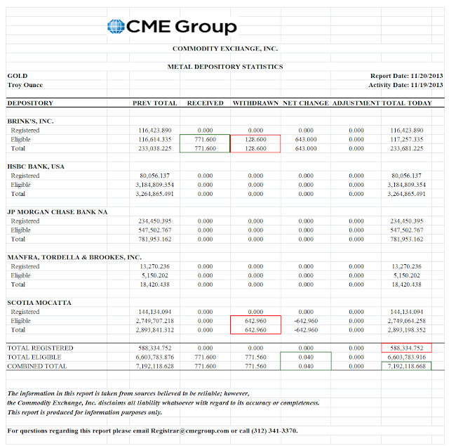 There was negligible activity in or out of the Comex bullion warehouses today, typical for non-active month of November.